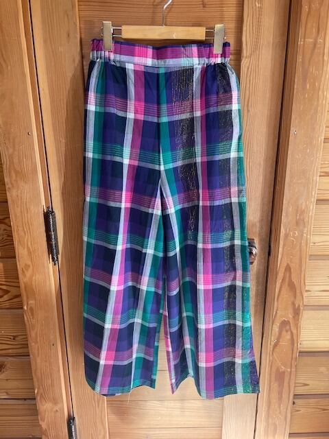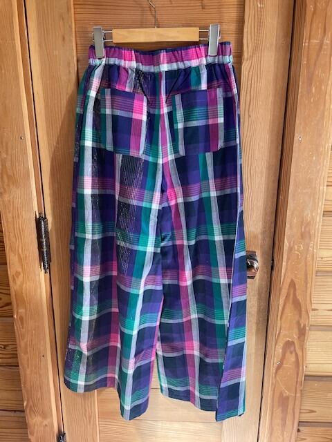 マドラスチェックに金糸が上品に織り込まれたデザイン。ワイドシルエットで体型カバーが可能。バックポケット付きで実用性も兼ね備えた一着。 サイズ : パンツ丈 95cm ウエスト 68~96cm(ゴム) 股下 63cm 股上 32.5cm 素材 : 表地: 綿100% (スリット糸使用) 裏地: 綿100%