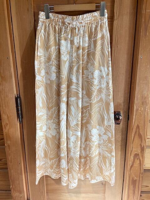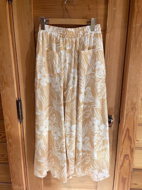 レーヨン麻素材のフレアパンツ。軽やかで通気性に優れ、汗ばむ季節にもさらっと快適。ヴィンテージ風のボタニカル柄が印象的で、ウエストはゴムと紐でサイズ調整可能。便利なポケット付きです。 カラー : オレンジ サイズ : パンツ丈 93.5cm ウエスト 68~100cm (ゴム・ヒモ) 股下 66cm 股上 29.5 素材 : レーヨン80% 麻20%